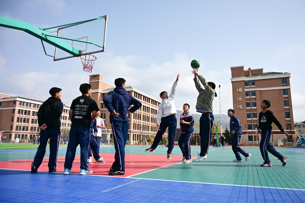 11月7日,在青海省西宁市果洛西宁民族中学,学生在打篮球。新华社记者 齐芷玥 摄