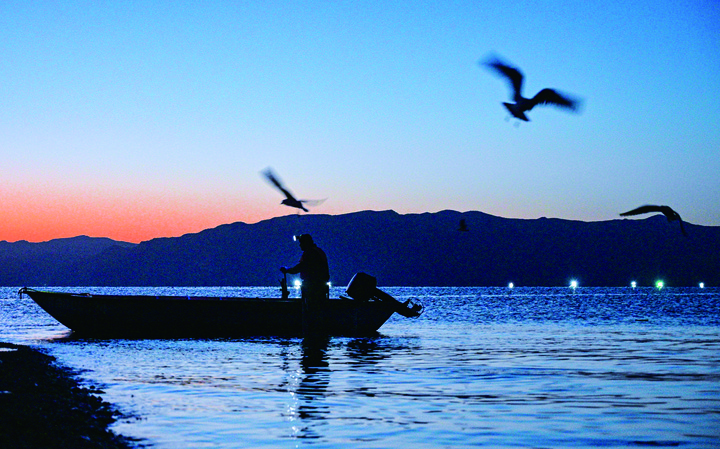翌日清晨,我早早来到昨日遇到许昌的岸边,想拍摄他们捕鱼归来的画面。高原的天亮得晚,6点仍是一片漆黑。几只渔船正向岸边驶来,船上渔民们的头灯挥出长长的光束,在银色的水波间勾勒出摇曳的船影。他们抬着一箱箱小银鱼上岸,依次过秤。一位收鱼人给渔民们记账、将鱼箱装车。他告诉我,收鱼人也是凌晨来到岸边,收好鱼就运往附近的加工厂。在这里,昼夜温差极大,寒气裹挟着水汽,10月初就湿冷无比。而渔民们十几年如一日在湖面打鱼,为的就是每天凌晨起网丰收的喜悦。